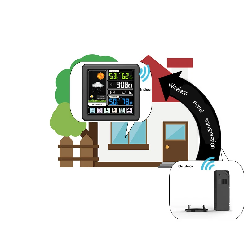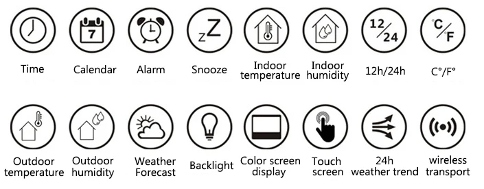 1. Display Date, Date, Week, Month, indoor/outdoor temperature and humidity;