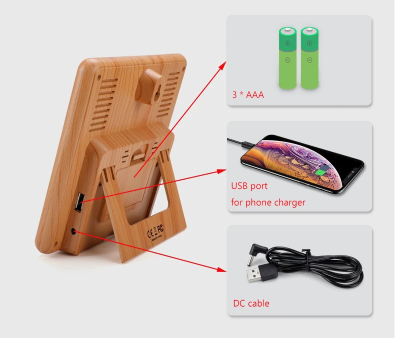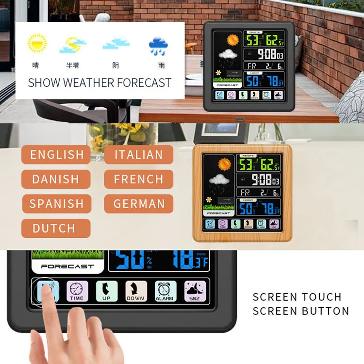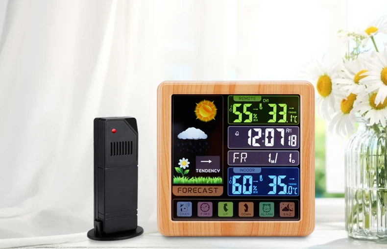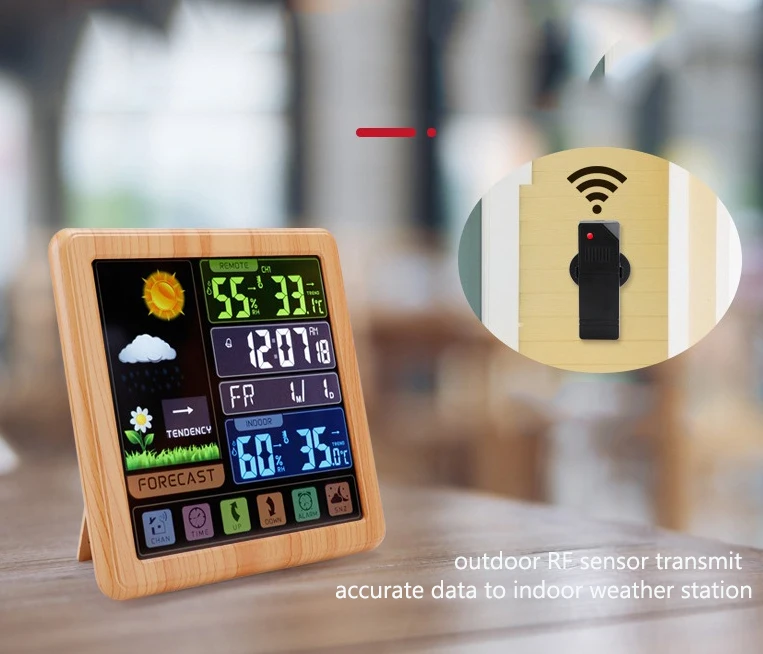 HD color screen with outdoor indoor sensor led temperature display wooden digital alarm clock for home and kitchen