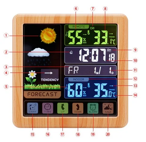 9. AM / PM 10. Time display 11. Date display 12. Indoor channal